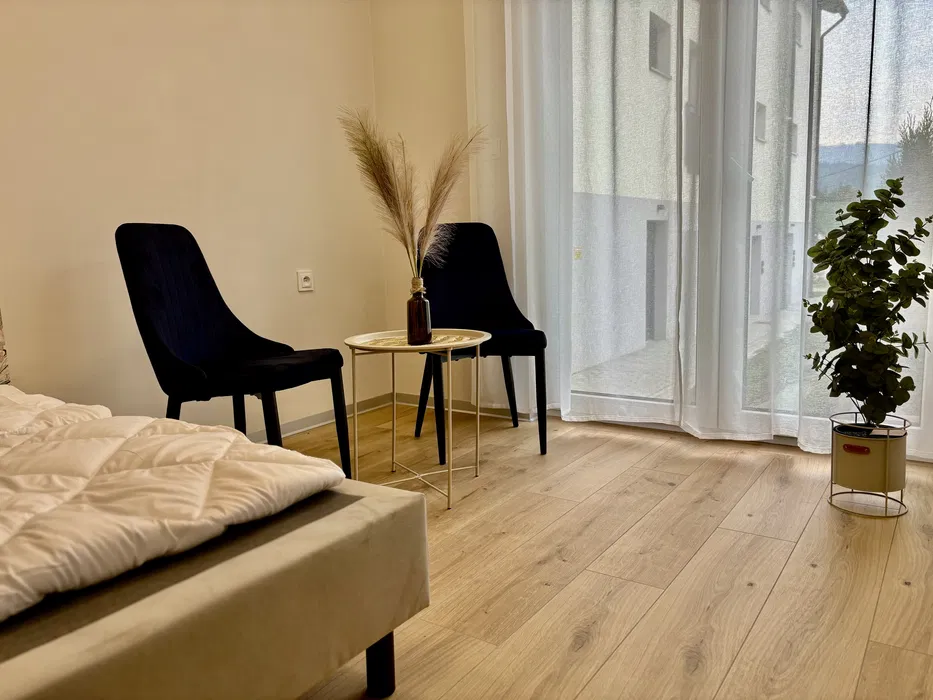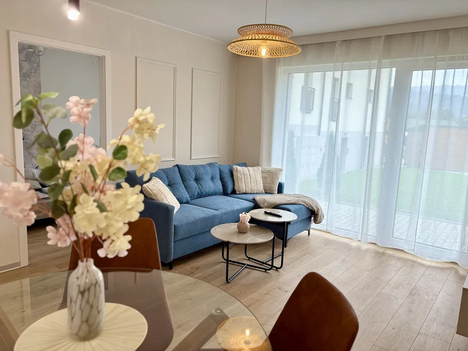przestronny salon z wygodną rozkładaną sofą (szerokość pow. spania po rozłożeniu 160 cm), telewizorem 50”, dwoma stolikami kawowymi i wiszącą komodą pod TV