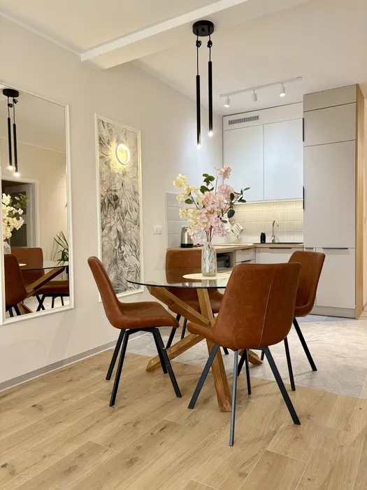 w pełni wyposażona otwarta kuchnia z częścią jadalną połączona z salonem (okrągły stół z 4 krzesłami), lodówką, mikrofalą i zmywarką
