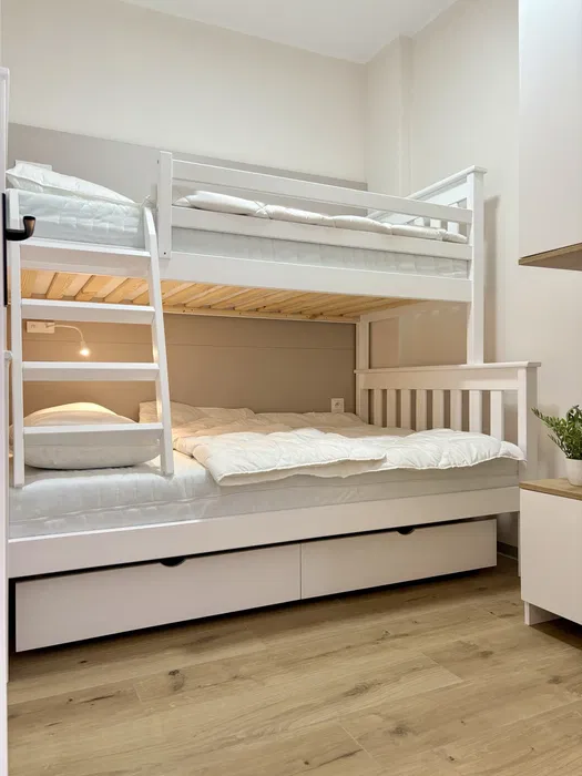 druga zamykana sypialnia z łóżkiem piętrowym 3-osobowym oraz funkcjonalna szafa na ubrania