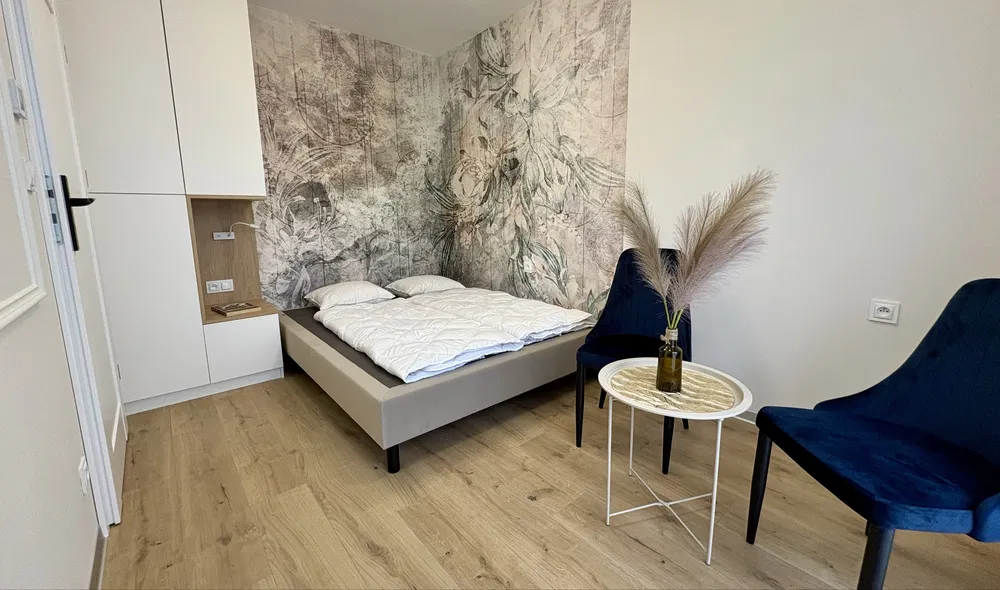 zamykana sypialnia z łóżkiem małżeńskim 140×200 cm, funkcjonalną szafą na ubrania
